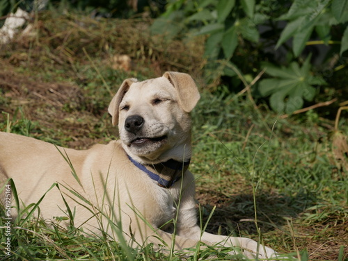 A small puppy is playing in a clearing on a sunny spring day. Homeless animals frolic on the street among the green grass.