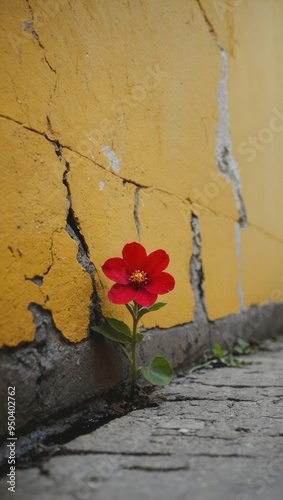 A small red flower is growing out of a crack in a brick wall