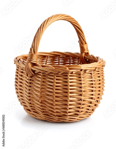 A small, round wicker basket with a handle