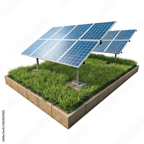 A small solar panel installation generates renewable energy on a green grass platform for sustainability isolated on transparent background