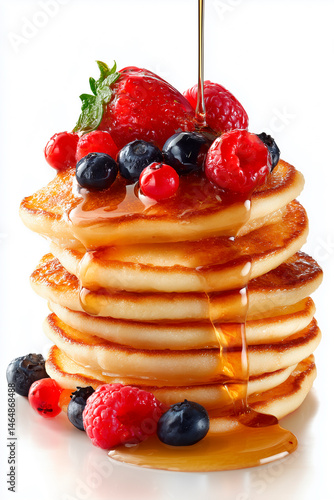 a small stack of fluffy pancakes topped with mixed berries and maple syrup drizzle, slightly tilted side view, solid white background