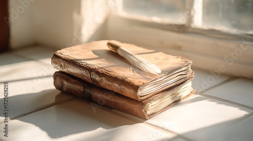 A small stack of leather books with pen