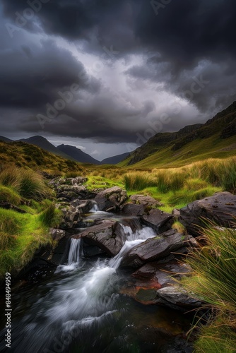 A small stream in the mountains of Guernsey, a grassy field, rocks and a waterfall, dark clouds overhead, dramatic lighting
