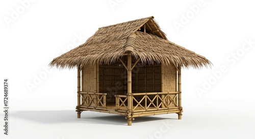 A small thatchroofed bamboo hut with a raised platform Xshaped railing is centered on a white background casting a slight shadow