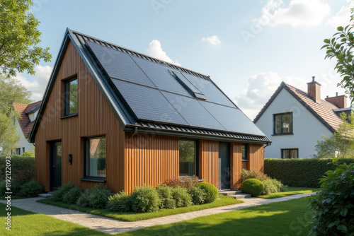 A small urban house with solar panels on the roof, set amidst other modern eco-friendly homes
