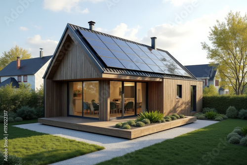 A small urban house with solar panels on the roof, set amidst other modern eco-friendly homes
