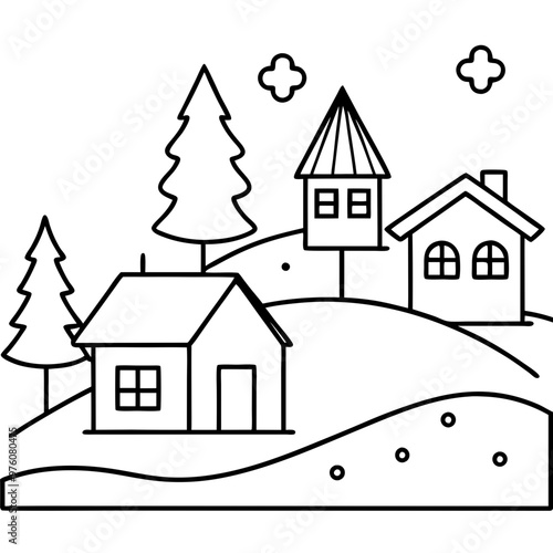 A small village scene with simple house outlines, trees, and snow-covered rooftop vector