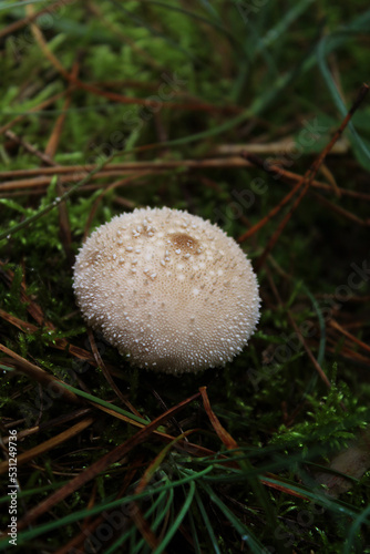 A small wild white mushroom on the grass in the forest