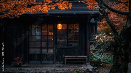 A small wooden house with vibrant autumnal tree branches