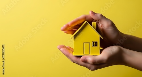 A small, yellow model home is held gently in protective hands against a bright yellow background.