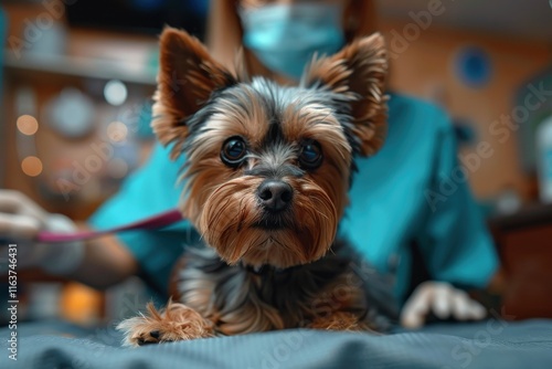A small Yorkshire Terrier being examined by a veterinarian in a clinic during a routine check-up