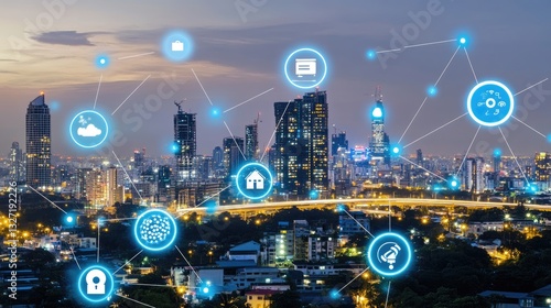A smart city at night powered by renewable energy, including biomass and solar sources.