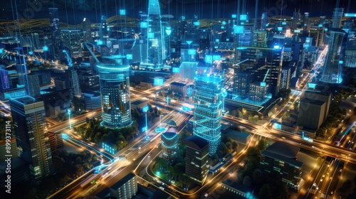 A smart city simulation with interconnected infrastructure, including transportation, energy, and public services, all managed through a central digital platform that ensures efficiency and