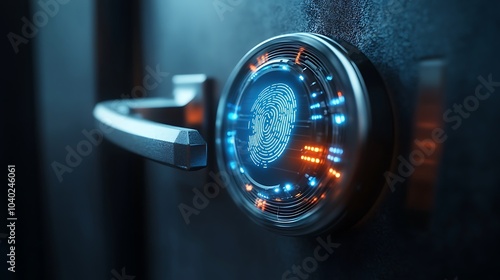 A smart door lock being unlocked with a glowing fingerprint scanner, holographic biometric interface confirming access, sleek modern design with metallic finish,