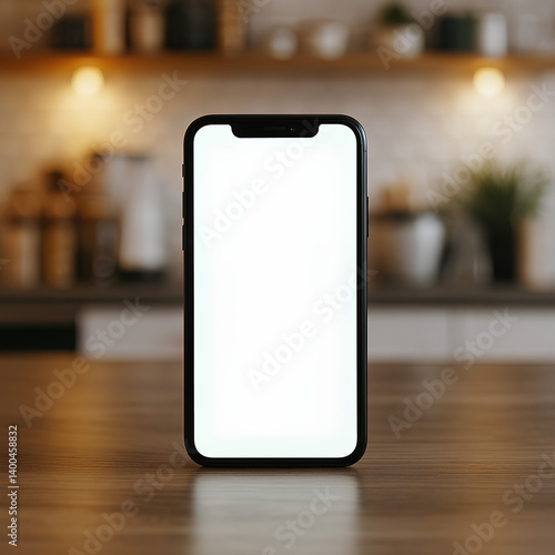 A smartphone with a blank screen stands upright on a wooden kitchen counter.