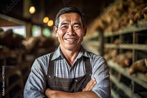 A smiling asian male chicken farmer stands with his arms folded in the poultry shed,generative ai