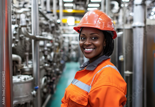 A smiling Black woman wearing an orange jacket and safety helmet stands in an industrial setting, surrounded by machinery
