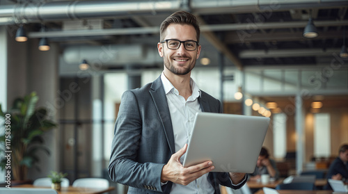 A smiling businessman holding a laptop, an image likely used for a professional stock photo site. It features an office background, creating a corporate feel