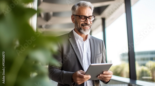 A smiling businessman in his forties holding an iPad, dressed smartly and wearing glasses with gray hair, stands on the balcony of a modern office space.