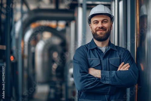 A smiling Caucasian male facility technician stands with his arms crossed, exuding confidence in a modern industrial environment. His posture and expression suggest approachability