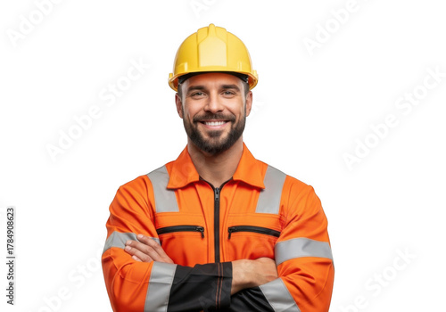 A smiling construction worker wearing a bright yellow hard hat and an orange high visibility safety jacket with reflective stripes isolated on transparent background