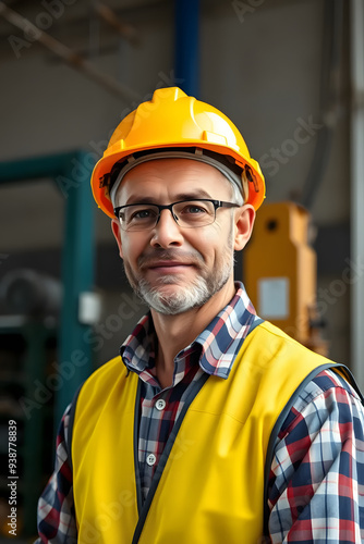 A smiling construction worker wearing a yellow hard hat and a safety jacket. He stands confidently in a construction site, showcasing a friendly demeanor.