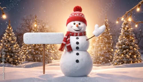 A smiling cute snowman with a knitted scarf and hat, holding a blank chalkboard or blackboard banner with space for adding text or a message.