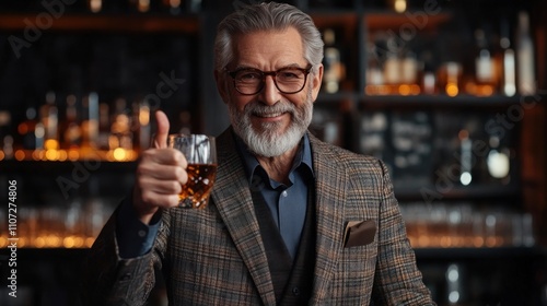 A smiling elderly man in a suit holds a drink, showcasing a warm and inviting atmosphere.
