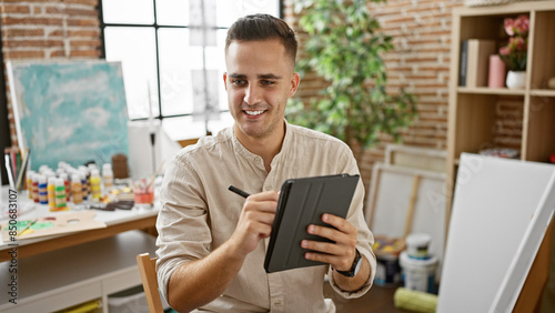 A smiling hispanic man works with a digital tablet in an artistically cluttered studio, exemplifying creativity and modern artistry.
