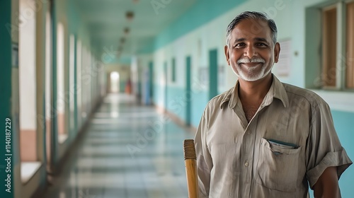 A smiling Indian school janitor holding a broom standing in the corridor of a school