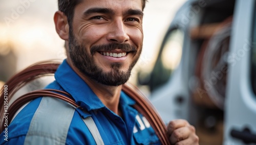A smiling individual holding a hose, ready for outdoor tasks or maintenance work