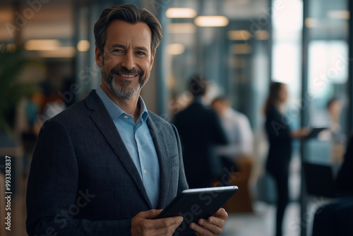 A smiling man in a suit, holding a tablet, is in an office with other people