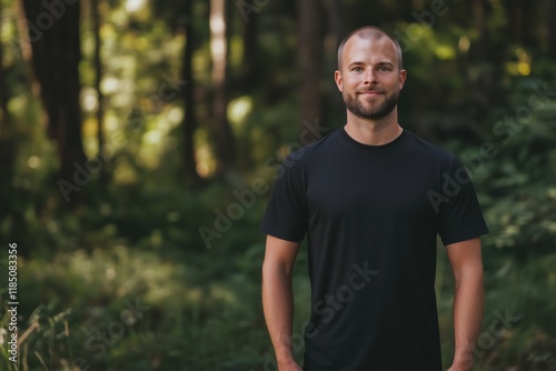 A smiling man stands confidently in a lush green forest, wearing a black t-shirt mockup. The background features tall trees and soft greenery, creating a serene atmosphere.