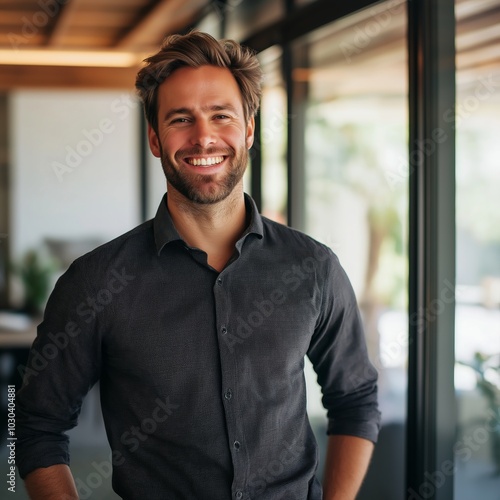 A smiling man stands in an office environment, wearing a casual shirt, spreading positivity.