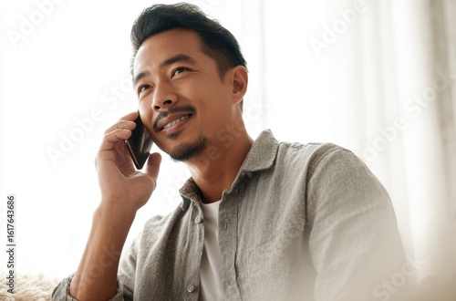 A smiling man talks on the phone, showcasing a relaxed and cheerful demeanor in a light-filled room.