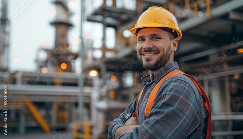 A smiling man, wearing a yellow safety helmet and orange vest, standing at a construction site with metal structures in the background, expressing confidence and safety commitment.