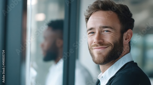 A smiling man with a beard stands near a large window, exuding confidence and positivity, with another figure slightly blurred in the background.
