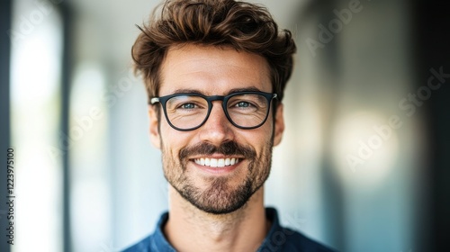 A smiling man with glasses, showcasing a confident expression, set against a blurred background.