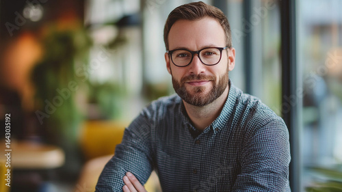 A smiling man with glasses sits confidently in a modern cafe, showcasing a relaxed yet professional demeanor amidst a warm and inviting atmosphere.