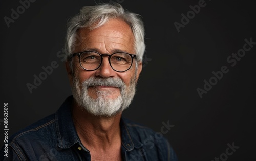 A smiling mature man with grey hair and beard wears glasses and a blue shirt. He is standing against a dark backdrop