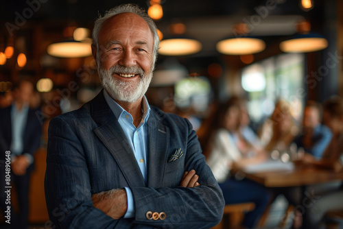 A smiling senior man in a business suit standing with arms crossed in an office meeting room, with a group of colleagues sitting in the background.
