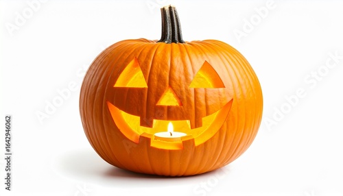 A smiling, spooky jack-o'-lantern isolated on a white background is a classic symbol of the Halloween season