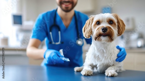a smiling veterinarian in blue scrubs holding a syringe while examining a small dog on a clinic table. The dog looks calm and curious, highlighting professional pet care and veterinary expertise.