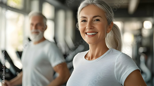 A smiling woman and a man exercising in a gym setting.