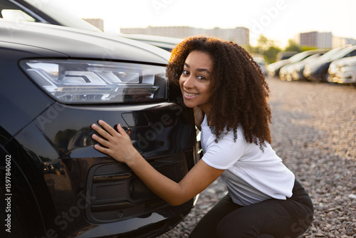 A smiling woman embraces a new black car, likely at a car dealership or lot, excited about her purchase.