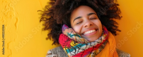 A smiling woman with a colorful scarf poses against a winter scene, exuding warmth and happiness.