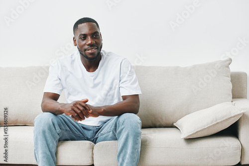 A smiling young Black man in a casual white t shirt and jeans sitting comfortably on a light sofa, radiating positivity and relaxation in a modern, minimalistic setting