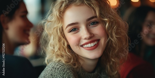 A smiling young blonde woman with curly hair radiates joy and confidence, her vibrant personality shining through her bright smile and sparkling eyes.