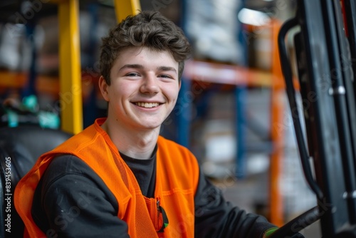 A smiling young man in an orange vest sitting on a forklift at a warehouse.