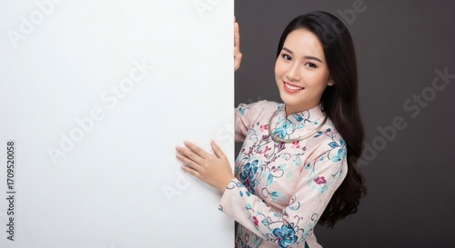 A smiling young woman in a traditional Vietnamese dress peeks out from behind a white board, looking at the camera.